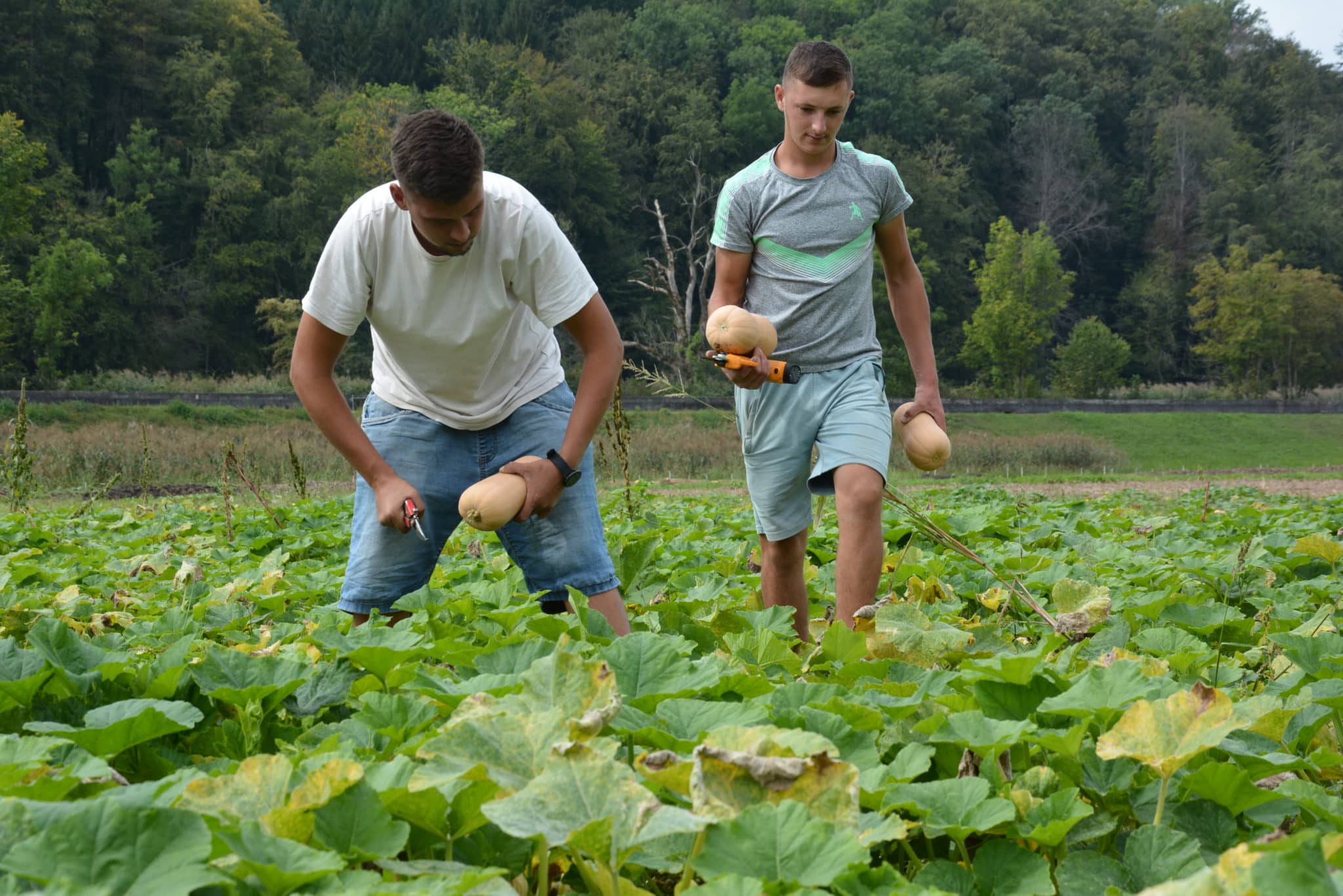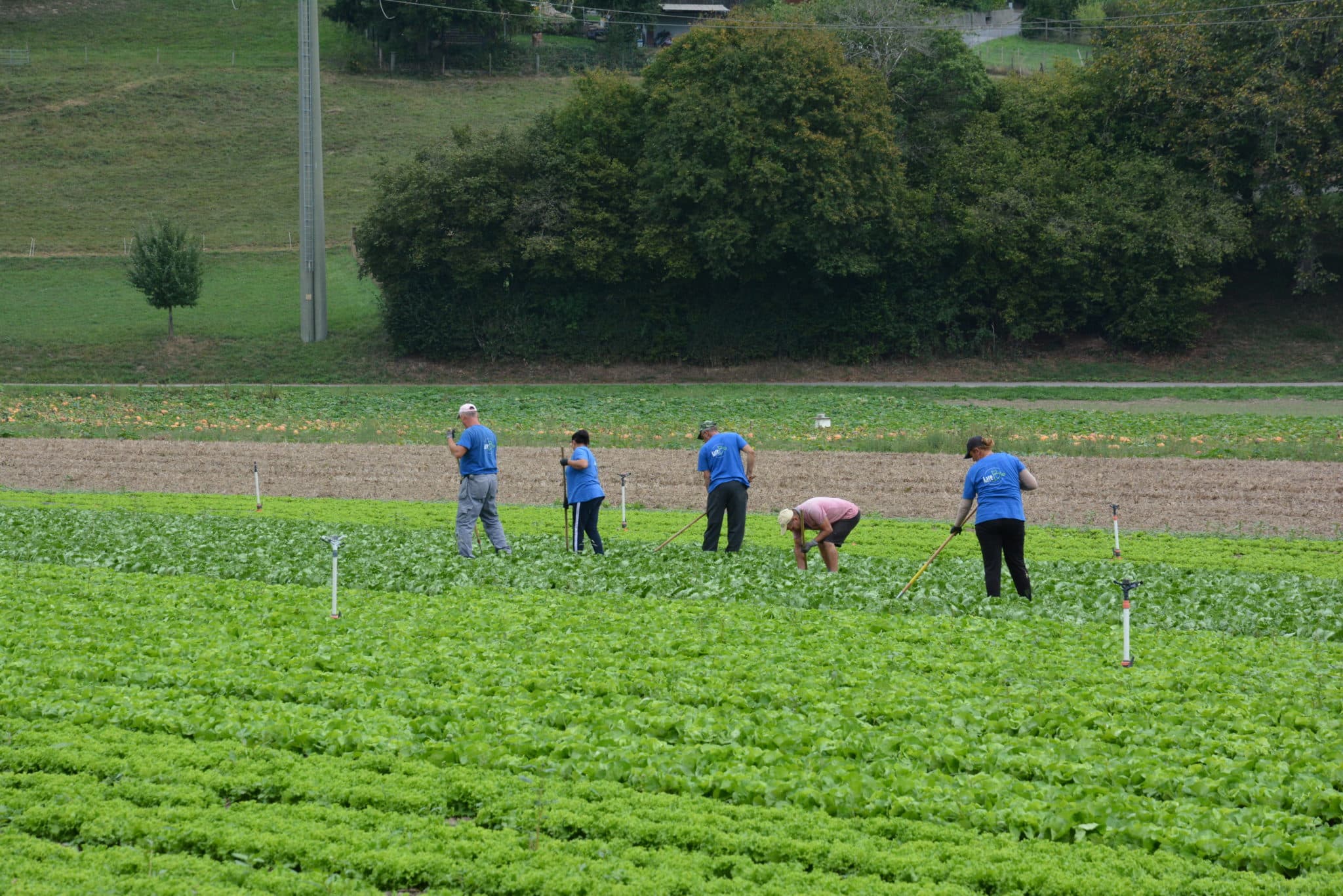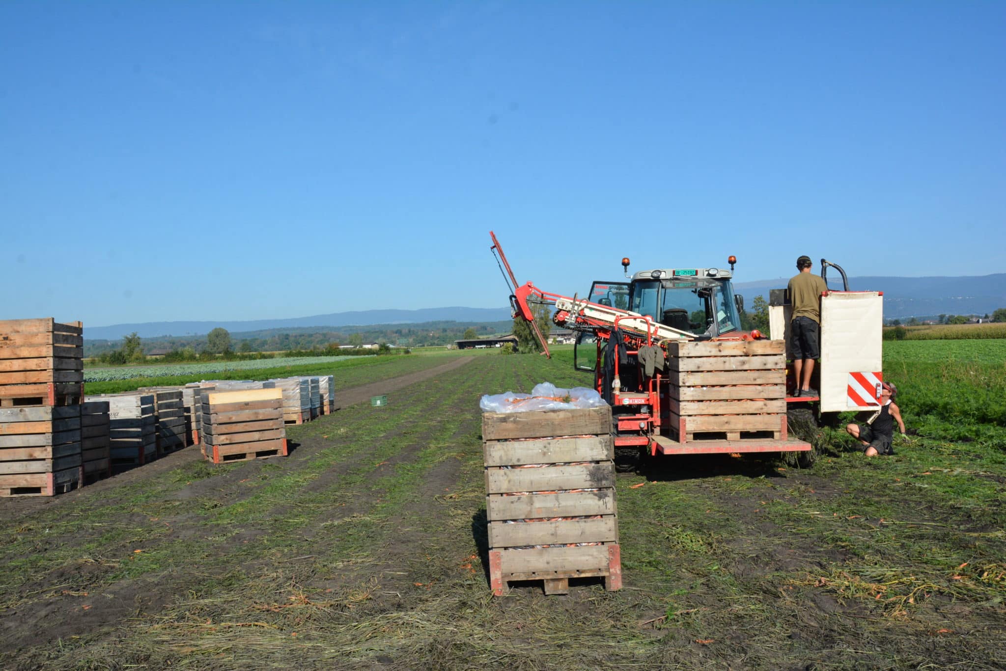 70 hectares : voilà la surface totale exploitée par Aare-Bio. Pendant les mois d’été, les trois responsables emploient 20 collaboratrices et collaborateurs. Ils produisent des légumes bio de plein champ et des légumes de garde, principalement des courges, carottes, salades, oignons primeurs et haricots grimpants. Avec la variété de haricot ProSpecieRara « Blauhilde », les trois producteurs apportent aussi une contribution majeure à la préservation de variétés anciennes. Enfin, leur activité englobe également la culture des céréales et l’élevage de vaches mères.